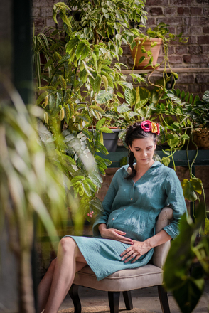 La future maman porte les accessoires Isis et Garance dans une version colorée.